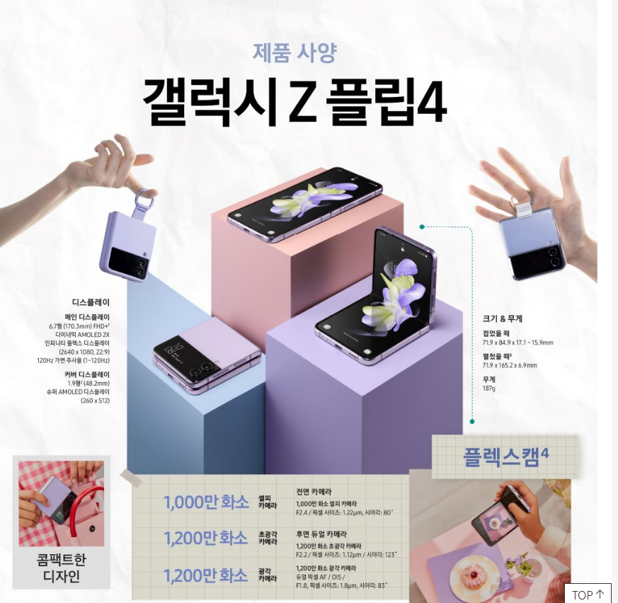 전작인 플립3에서 라벤더 색상의 인기에 이어 플립4에서는 시그니처 색깔을 보라퍼플으로 선정했습니다. 실물을 봐야 알겠지만 핑크골드나 블루가 색상이 잘 나온 것 같지는 않습니다. 삼성 디지털 플라자나 하이마트 등에서 확인하시면 좋을 것 같습니다.