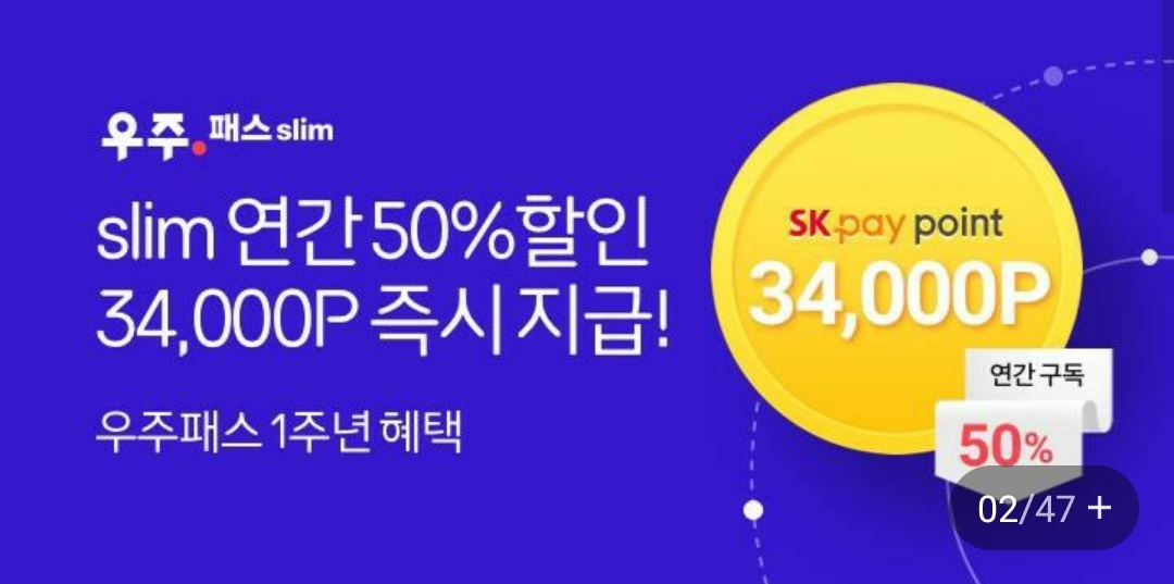 지금 11번가에서는 선착순 10만명에게 우주패스 연간권 50%할인쿠폰을 줍니다. 11번가에서는 우주패스 슬림과 우주패스 미니 50%할인쿠폰을 주는데, 아무 쿠폰이나 받아두면 우주패스ALL에서도 사용할 수 있습니다. [ 쿠폰 바로가기 ]