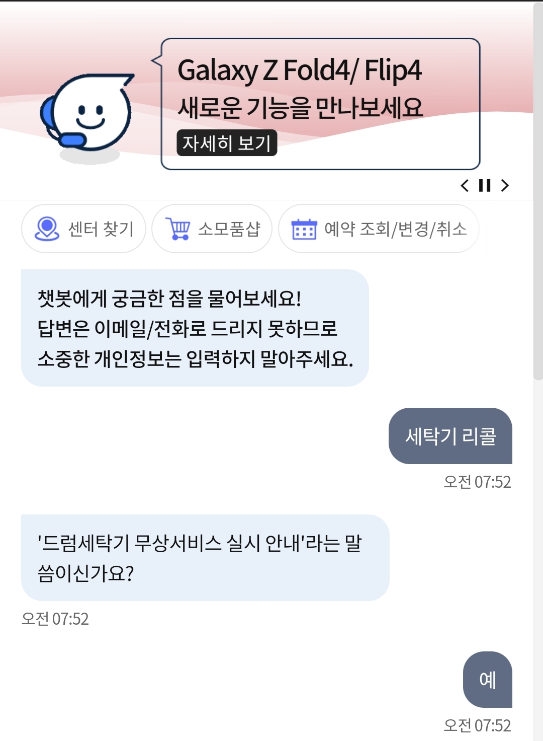 삼성전자 세탁기 도어 유리가 깨지면서 안전을 위해 리콜을 진행하고 있습니다. 리콜 접수 방법 중에 가장 간단한 챗봇 서비스로 리콜을 접수하는 방법을 알려드릴게요. 짧고 간단합니다.