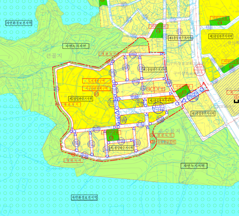 아래 도면에서 연한 노란색은 상가주택(단독주택용지)이고 1층에는 상가 2~3층에는 주택 또는 원룸을 지을 수 있어요. 진한 노란색 부분은 상모e편한세상 부지와 준주거 용지입니다. 준주거용지는 상모지구에서 실질적으로 상업용지의 역할을 할 것 같아요.