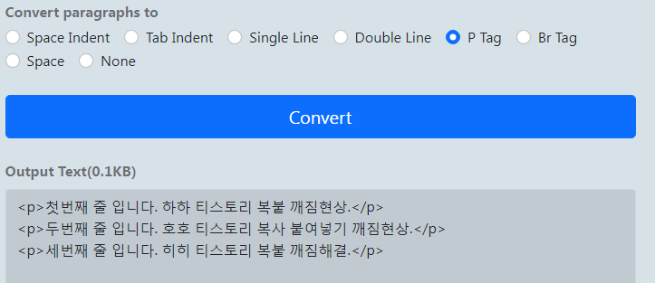 말씀드린대로 설정을 하고 티스토리 복붙을 하고 Convert를 누르면, 자동으로 P태그가 붙어서 변환이 됩니다. 그리고 이렇게 변환된 것을 HTML에 삽입하면 간단합니다.