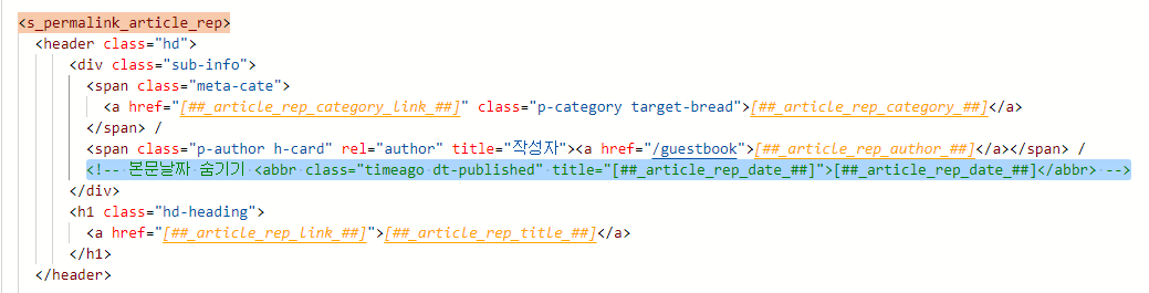 330번째 쯤에서 <s_permalink_article_rep>를 찾아줍니다. 그리고 <abbr> 태그를 찾아서 해당 태그를 모두 주석처리를 해줍니다.